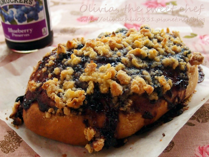 食材 : 高筋麵粉, 低筋麵粉, 乾酵母, 細砂糖, 海鹽, 無鹽奶油, 雞蛋液, 牛奶, 藍莓果醬, 奶酥