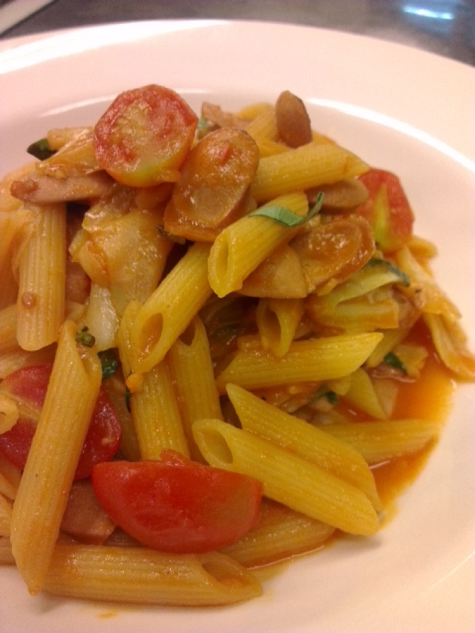 食材 : 筆管麵, 蕃茄汁, 小番茄, 煙燻脆腸, 九層塔, 大蒜