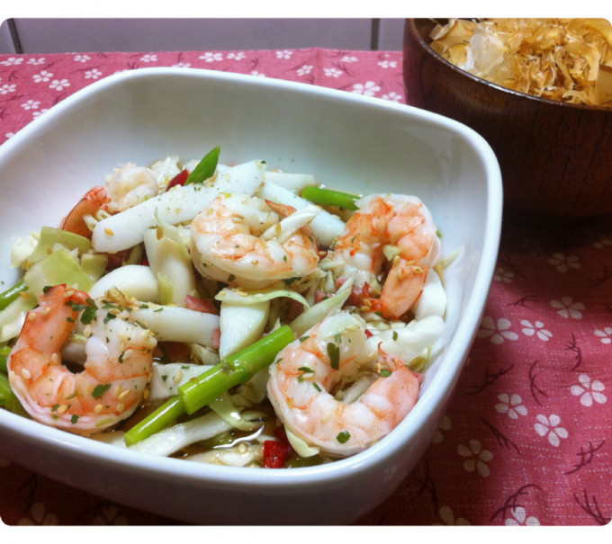 食材 : 火腿, 魷魚身, 蝦仁, 蘆筍, 高麗菜絲, 白芝麻, 辣椒, 日式和風醬, 鰹魚露