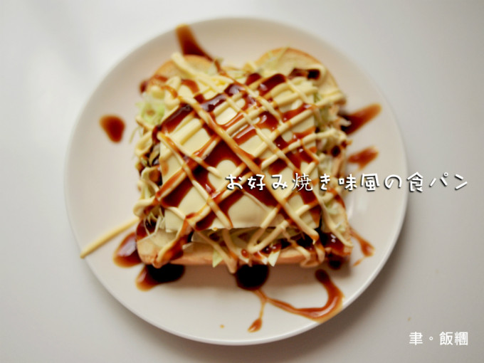 食材 : 厚片吐司, 高麗菜絲, 蟹肉條(可替換), 起司片, 日本美奶滋, 日本御好燒醬, 柴魚粉