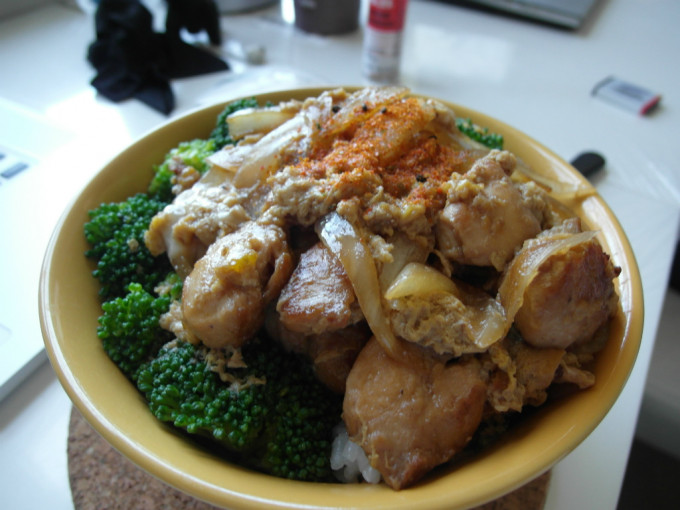 食材 : 去骨雞腿肉, 洋蔥, 蛋, 綠花椰菜, 七味粉, 水, 味醂, 醬油, 糖, 白胡椒, 香油, 醬油, 太白粉