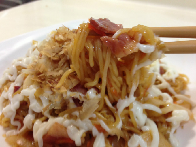 食材 : 洋蔥絲, 胡蘿蔔絲, 高麗菜切片, 培根, 【醬汁】番茄醬, 【醬汁】醬油膏, 【醬汁】烏醋, 【醬汁】糖, 鹽巴, 美乃汁, 柴魚片, 麵條