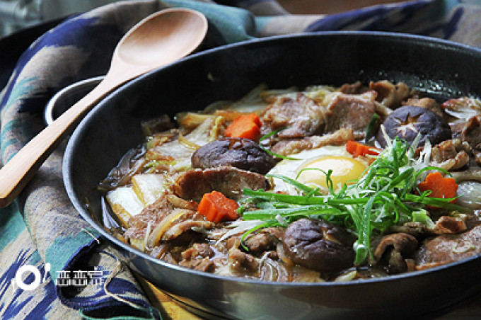 食材 : 火鍋梅花豬肉片, 奶 油, 大白菜, 蛋, 香 菇, 紅蘿蔔, 洋 蔥, 青 蔥, 高 湯, 醬油, 清酒, 味醂, 細砂糖