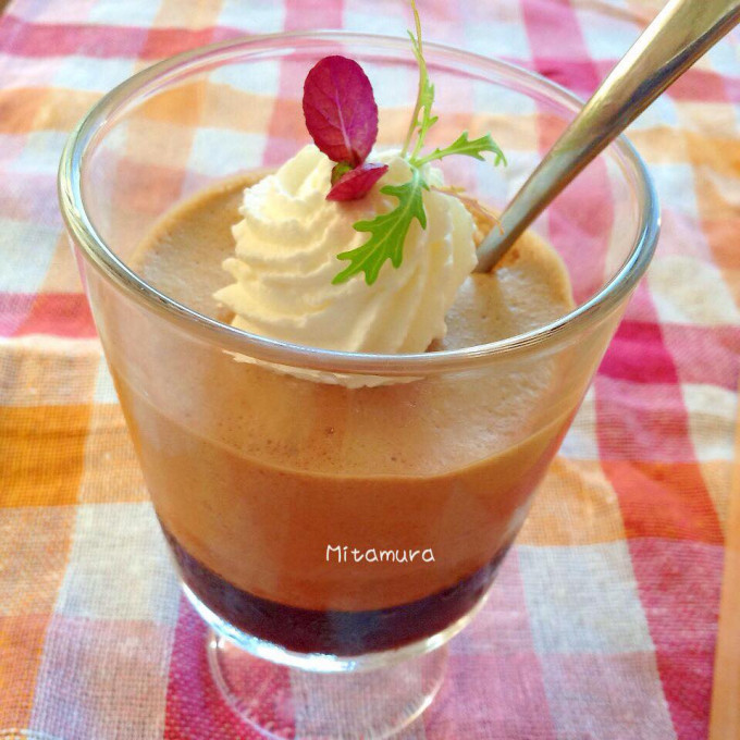 食材 : 吉利丁粉, 冷水, 即溶咖啡粉, 砂糖, 水, 蛋黃, 蛋白, 即溶咖啡粉, 鮮奶油水, 牛奶, 砂糖, 吉利丁粉, 冷水, 鮮奶油, 砂糖
