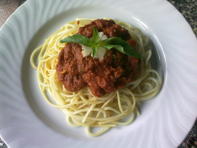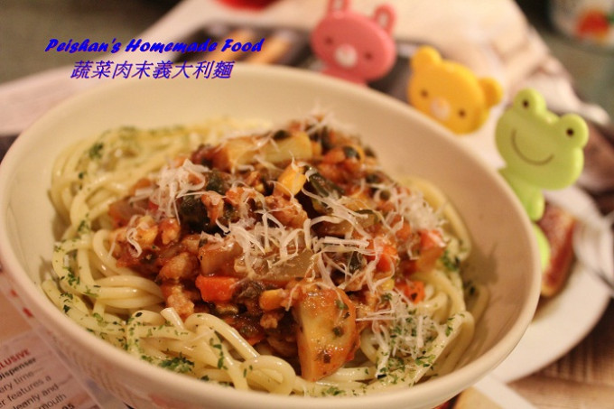 食材 : 市售義大利麵紅醬, 豬 or 牛絞肉, 蔬菜類, 蒜頭切末, 醬油, 麻油, 黑胡椒粉, 水