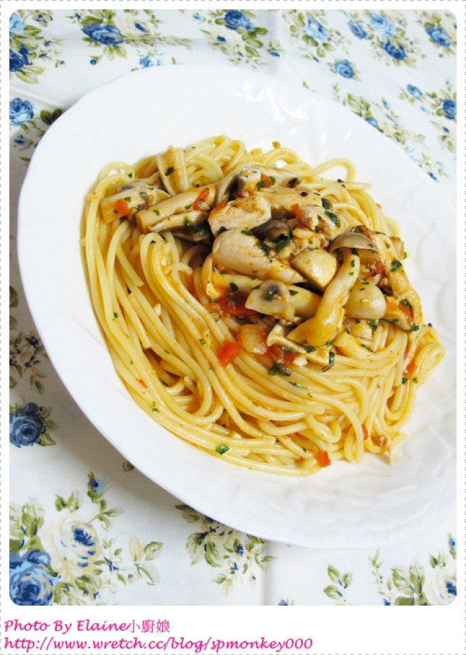 食材 : 小蕃茄, 雞胸, 洋蔥, 大蒜, 新鮮羅勒(可用九層塔代替), 新鮮迷迭香(可用乾燥迷迭香代替), 紅酒醋, 乾燥月桂葉, 橄欖油, 黑胡椒, 冰糖, 義大利麵, 柳松菇, ]義大利綜合辛香料, ]鹽