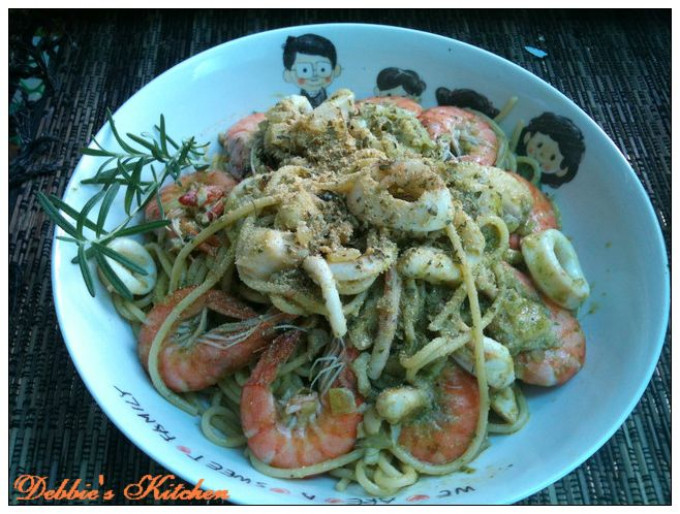 食材 : 蝦子, 鯛魚片, 透抽, 自製青醬, 無鹽奶油, 洋蔥末, 義大利麵
