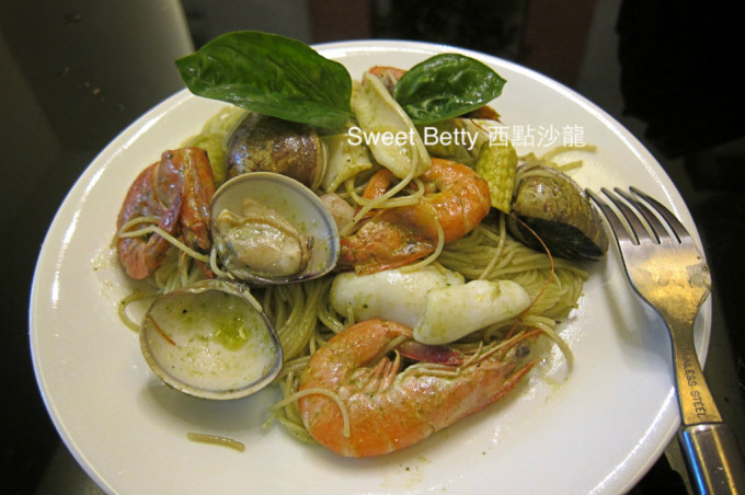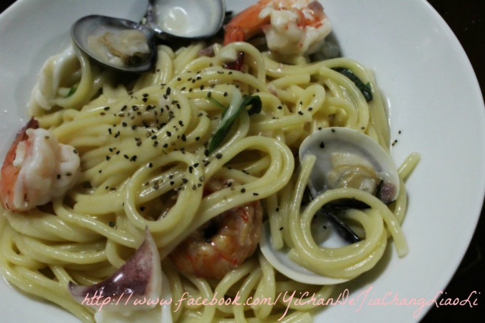 食材 : 義大利麵, 蛤蜊, 小管, 蝦仁, 牛奶, 乳酪起司條, 糖, 鹽, 酒, 洋蔥, 蒜頭, 九層塔