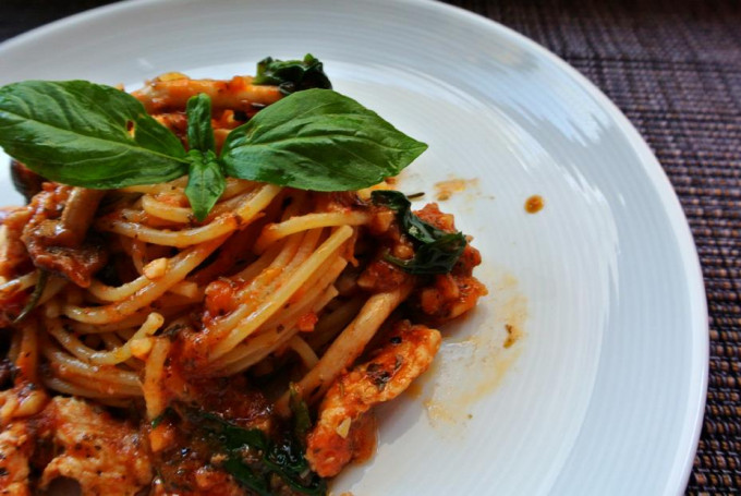 食材 : 洋蔥, 蒜末, 牛蕃茄, 雞柳條, 九層塔末, 綜合菇菌, 義大利圓麵, 岩鹽, 白酒, 岩鹽, 冷開水, 蕃茄醬, 現蘑黑胡椒