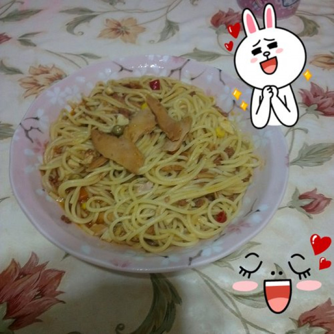 食材 : 辣肉醬罐頭, 鮪魚罐頭, 義大利麵條, 蒜頭