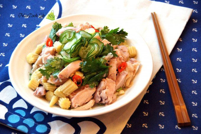 食材 : 去骨土雞腿肉, 小黃瓜, 玉米筍, 糖, 蒜末, 辣椒, 香菜, 鹽, 米酒, 鹽, 胡椒粉, 花椒粒, 蔥段, 薑片, 八角, 鹽