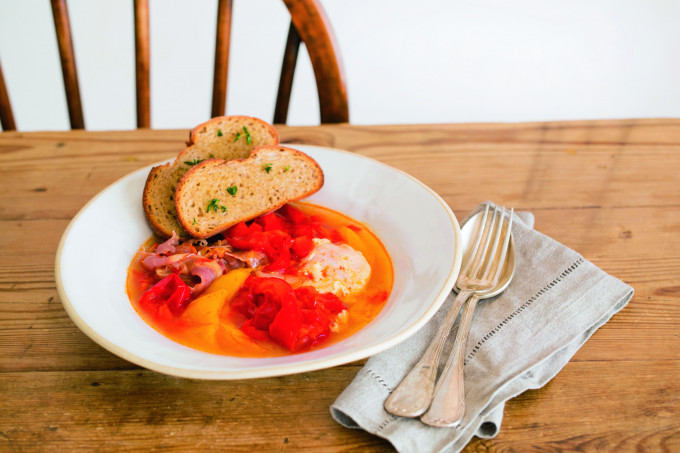 食材 : 甜椒(紅色), 甜椒(橘色或黃色), 蒜頭, 洋蔥, 蕃茄(熟透的), 鹽, 初榨橄欖油, 切片生火腿(撕碎), 蛋, 切片法國麵包, 百里香, 初榨橄欖油(麵包用)