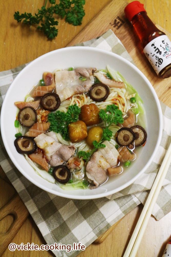 食材 : 栗子高湯, 乾香菇, 生栗子, 魷魚, 豬五花肉片, 五木特選油麵, 蛋, 蔥切段, 高麗菜, 豬龍骨, 剝殼生栗子, 水, 鹽適量, 白胡椒1匙, 日式醬酒(昆布), 日式辣油