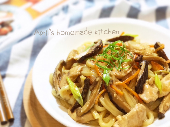 食材 : 雞胸肉, 乾香菇, 紅蘿蔔, 洋蔥, 蔥, 冷凍烏龍麵, 醬油, 麻油, 胡椒, 酒, 太白粉, 蠔油, 醬油, 烏醋, 七味唐辛子