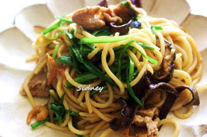 食材 : 油麵, 梅花肉切片, 香菇切絲, 蝦米, 油蔥酥, 洋蔥切絲, 胡蘿蔔刨絲, 木耳(泡發)切絲, 韭菜一小把切段, 醬(蔭油)油膏或素蠔油, 米酒, 太白粉, 鹽, 醬油, 烏醋, 泡香菇水