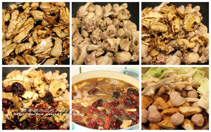再起鍋熱油,放入燙過的鴨肉拌炒,接著加入炸過薑塊薑片、酒及中藥材,加蓋用小火燜煮1小時(我的是冷凍鴨腿又用LC鍋,所以燉煮的時間比較短,如果是台灣的紅面番鴨請調整烹調時間)