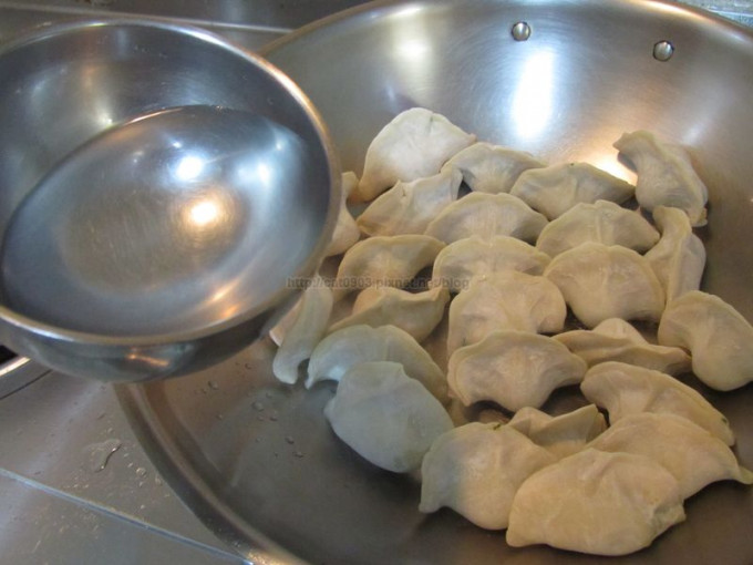 等餃子底部有薄薄一層皮被煎赤,沿著鍋內淋上半碗水。