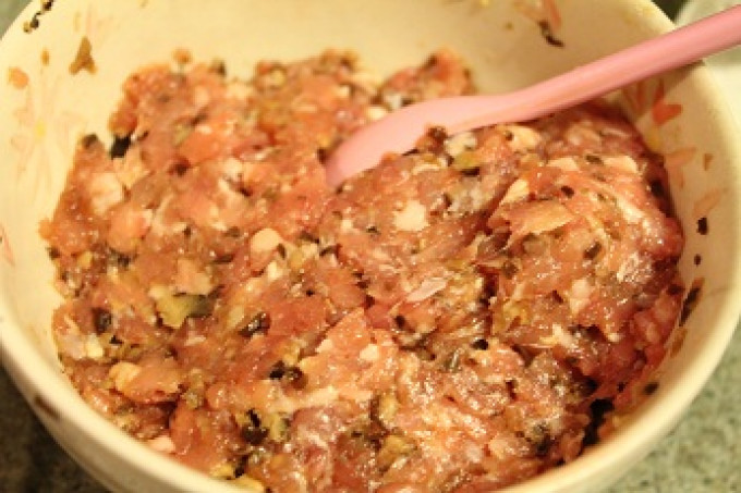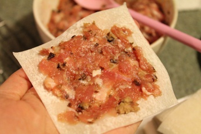 取一張餛飩皮, 將肉餡壓薄鋪平, 周圍留1公分的邊