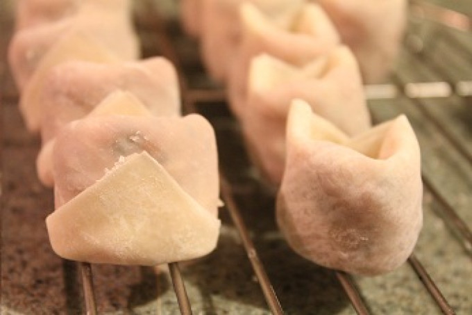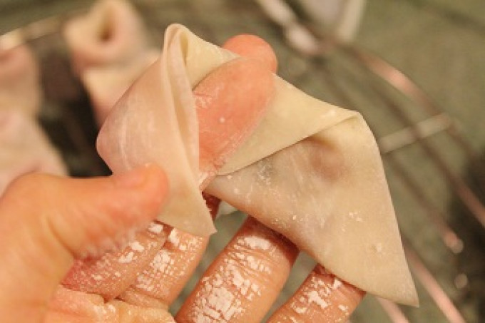 在餛飩皮周圍抹點水, 對摺成三角形, 再將三個邊向中間收起黏緊