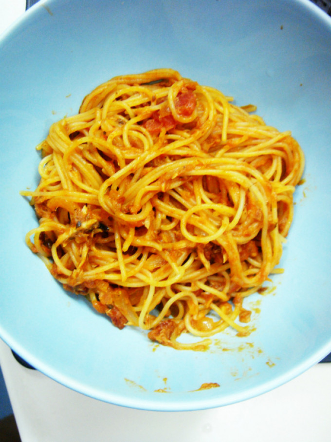 醬汁可以根據自己喜好放一點水,我喜歡用煮義大利麵的水,一方面比較省,一方面煮過義大利麵的水會讓醬汁比較稠。醬汁完成後就把義大利麵放進去拌炒。