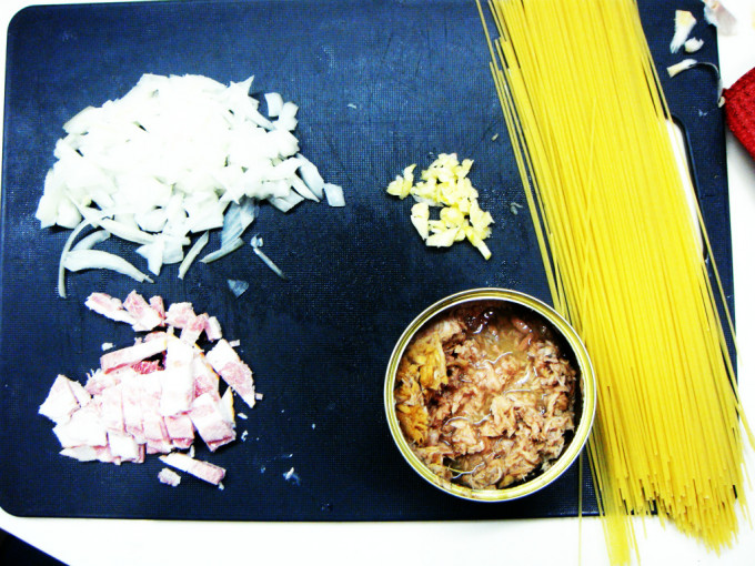 培根和洋蔥切丁,蒜頭和巴西里切碎。起一鍋熱水加鹽,水滾後把義大利麵呈散狀放下去煮