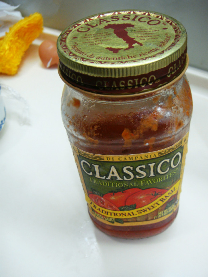放入義大利麵醬,再把鮪魚放進去,我這裡用的是水煮鮪魚,如果是用油漬鮪魚,油量跟培根就要減少一點喔!