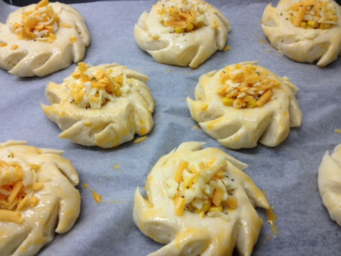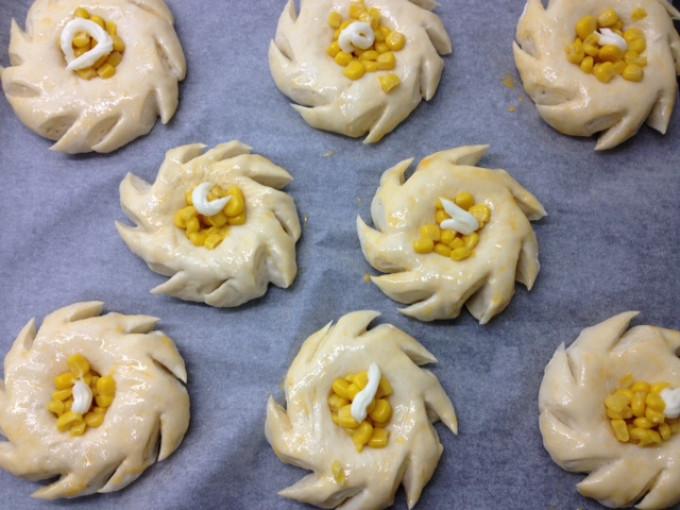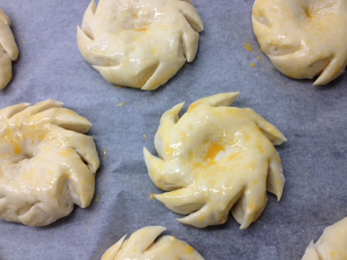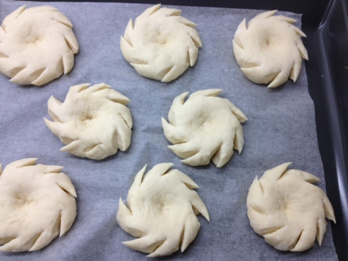 烤箱預熱170度。用利剪刀斜剪切口,約8~9刀(每刀2~3cm),平均將周圍剪開,可以旋轉烤盤,幫助剪刀整型,剪斷就要迅速抽開剪刀,麵團才不會又黏回去。