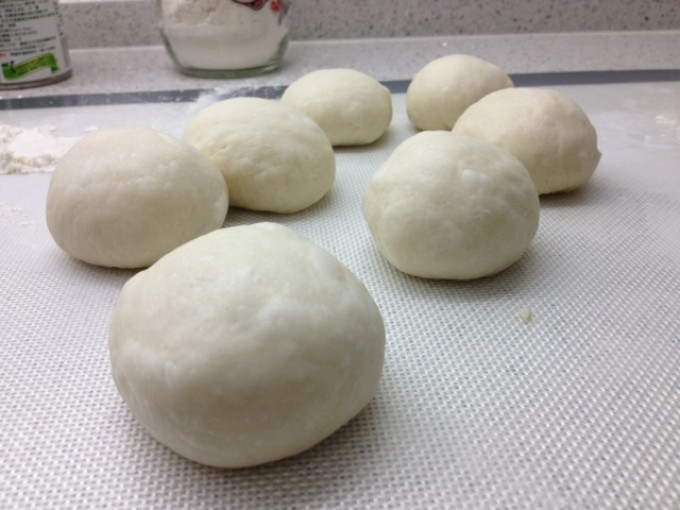 材料投入麵包機,[酵母]投至孝母匣,麵糰模式1小時後取出,分割成8等份。