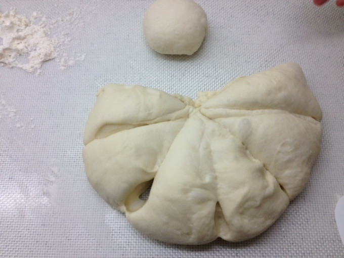 左手捏著麵糰中心,右手邊旋轉麵糰,類似甜甜圈的做法,但中間不要有洞,只要有凹槽即可,發酵30~40分至兩倍大