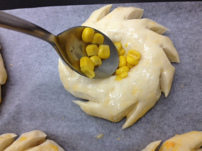 將瀝乾水分的玉米粒加入凹槽內,可用湯匙將玉米粒下壓,坎在麵糰內