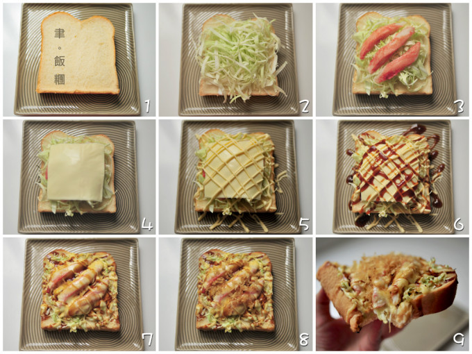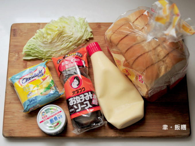 厚片吐司、高麗菜絲、蟹肉條(or鮪魚罐頭)、起司片、日本美奶滋、日本御好燒醬、柴魚粉。厚片吐司上的配料家裡有什麼就加什麼,只要最後加上日本美奶滋跟御好燒醬就對了!