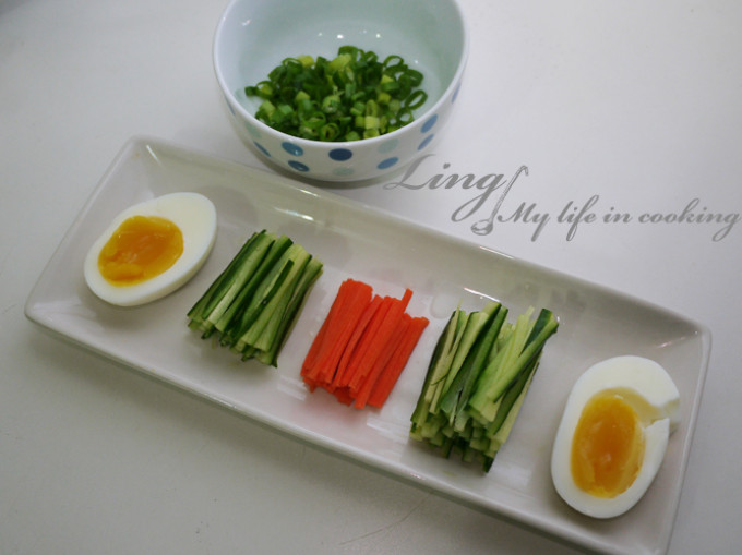 將炸醬麵配料小黃瓜跟胡蘿蔔切絲,切個蔥花,煮個水煮蛋。