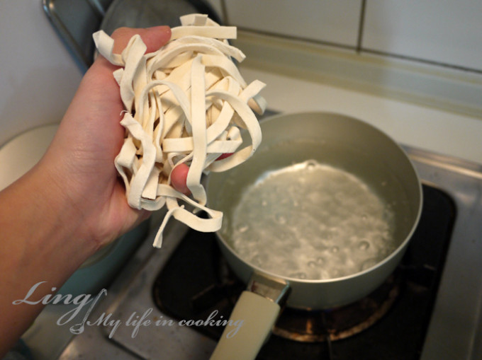 煮一鍋水,麵條依照自己喜愛的口感煮熟,拿起瀝乾;