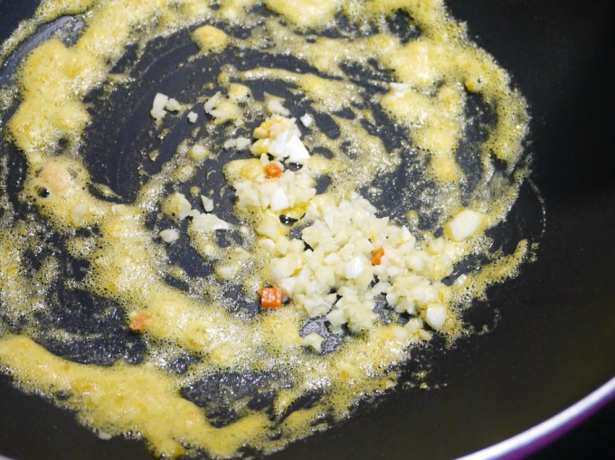取一鍋,加入一匙油後開中小火加熱後轉小火,先放入蛋黃炒出泡泡後,再放入蒜碎炒香
