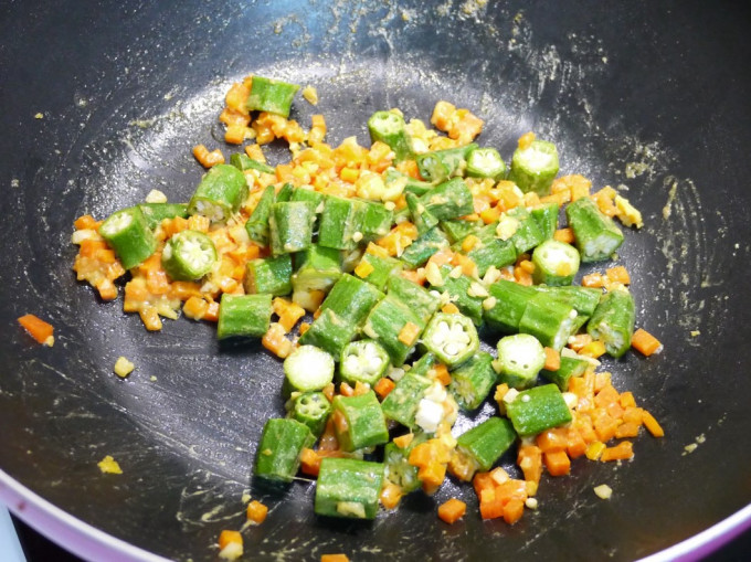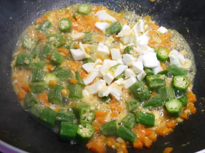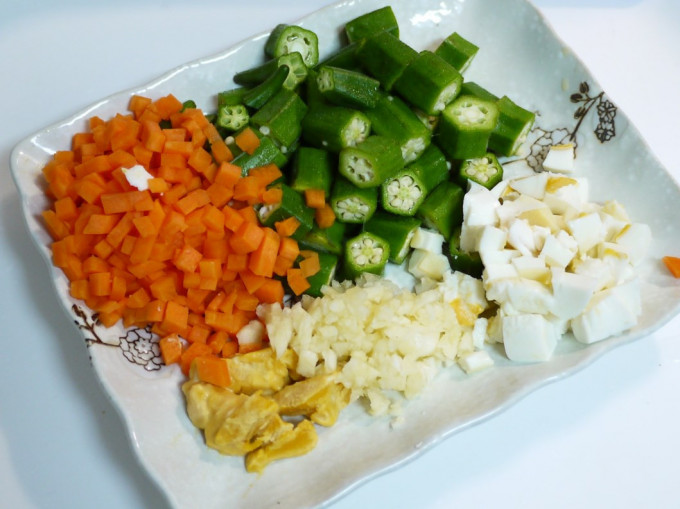 秋葵去頭後切小段,鹹蛋(含殼)用刀子切半後,用小湯匙將蛋黃與蛋白挖出切碎。