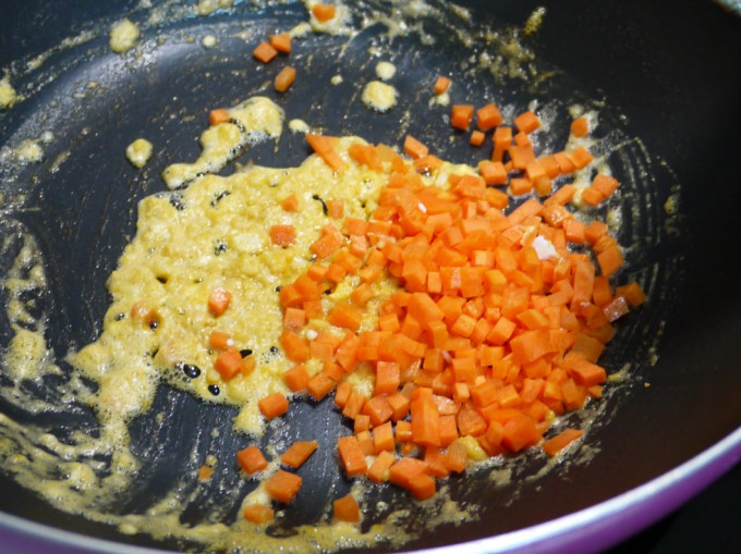 蒜頭香味出來後,放入紅蘿蔔碎炒個幾下後,加入一大匙米酒拌炒。