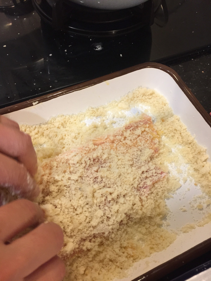 油溫到達170度時,轉中火,將肉片依序:1.薄薄沾滿低筋麵粉,拍打掉多餘粉 2. 沾蛋液