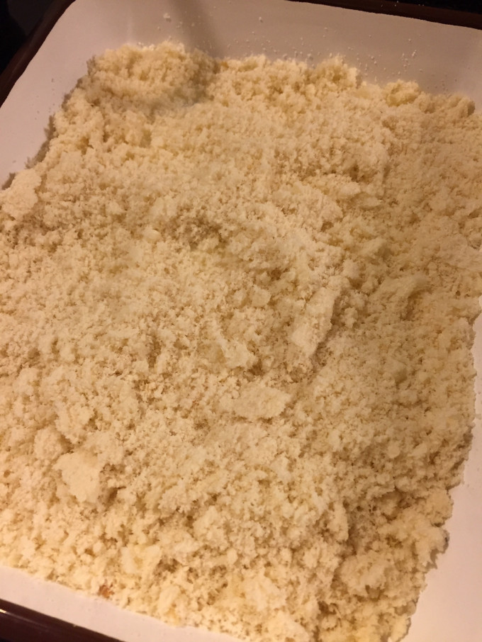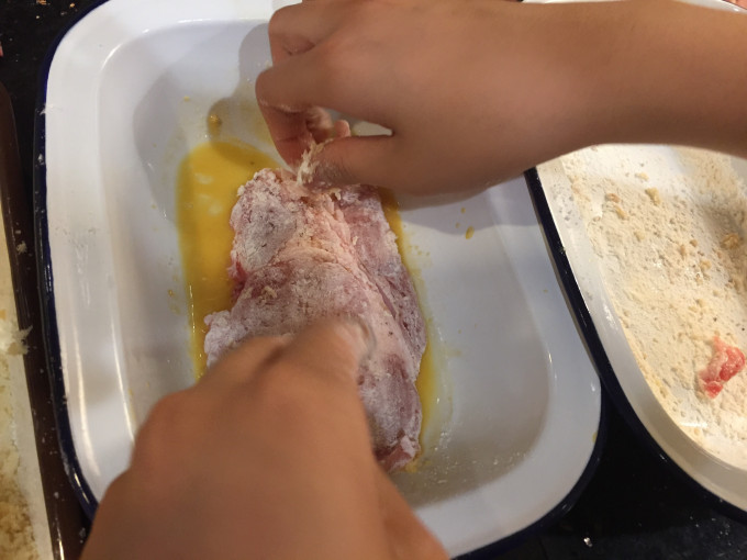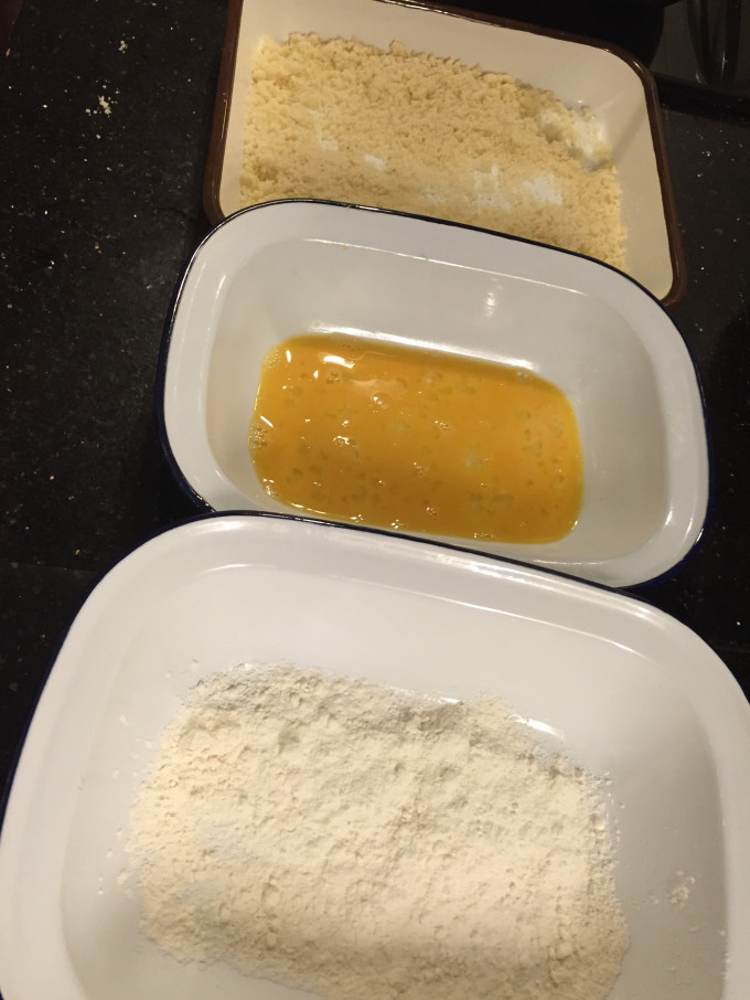 準備三個調理盆,分別放入1.低筋麵粉 2.蛋液 3.麵包粉