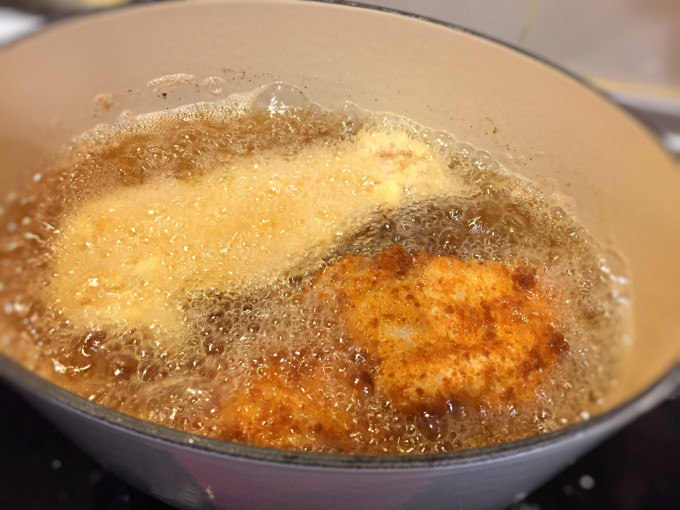 放入油鍋,一面各炸1.5分鐘(肉厚炸約2分鐘)或呈金黃,翻面同樣步驟