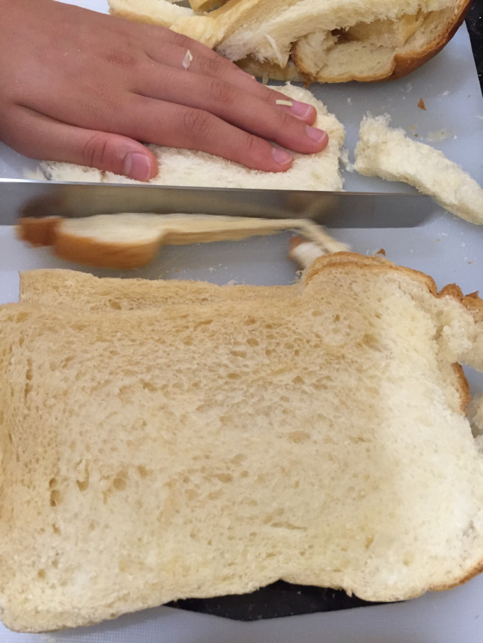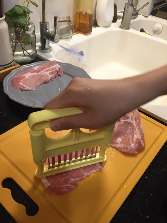 將里肌肉每片的邊緣及中間都用刀子略畫一下斷筋(或用斷筋器處理),以免炸豬排過程豬肉捲縮