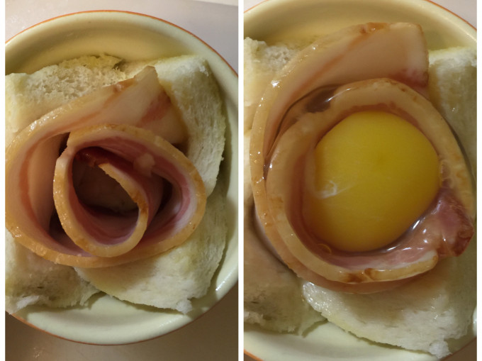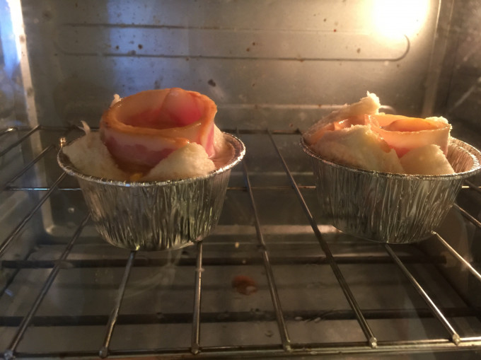放入少許雙色起士絲(可省略),將培根延土司邊緣圍繞成捲曲狀,打入雞蛋於中心點,蛋白散到外圍沒關係