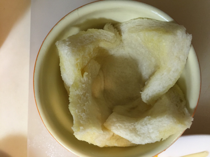 取一烘培杯子或是可放進烤箱的小碗都可以,刷上一層奶油,將步驟1的土司塞進烘培杯子中,用手按壓底部,邊與邊之間使其交疊成一杯狀