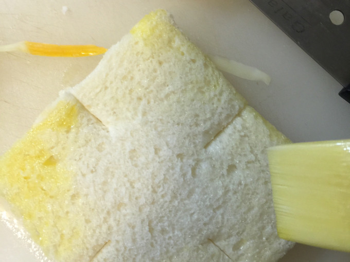 先將土司切邊,在四邊的中心點,切出2CM的折線,在四邊塗上奶油 無鹽奶油隔水加熱至融化