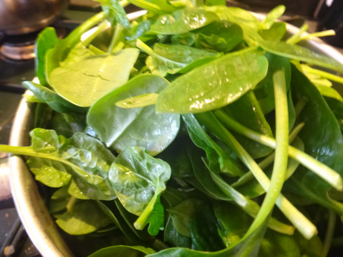 用一湯匙將菠菜跟扁豆混合後即可上菜。