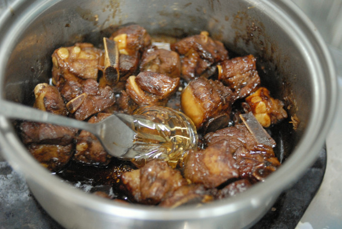 然後下黑醬油(老抽),糖及200毫升水拌勻,煮沸後,轉小火,蓋上鍋蓋煮45分鐘(要不時攪拌,令顏色均勻,如沒有水,要加水,以免燒焦)