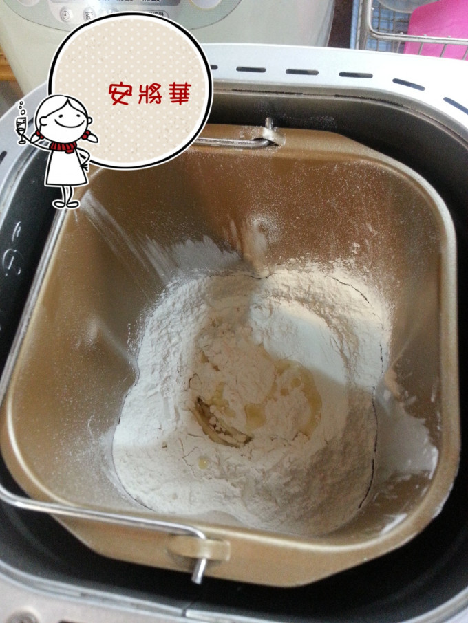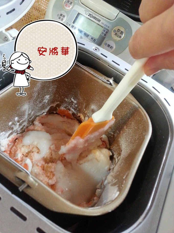 將紅蘿蔔泥、橄欖油、糯米粉放入麵包機啟動打麵糰程序