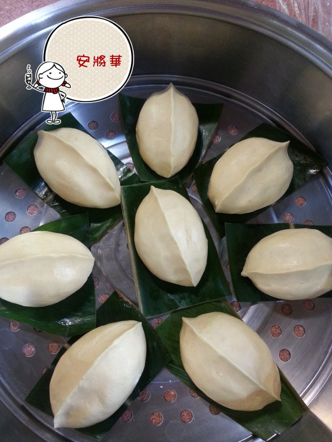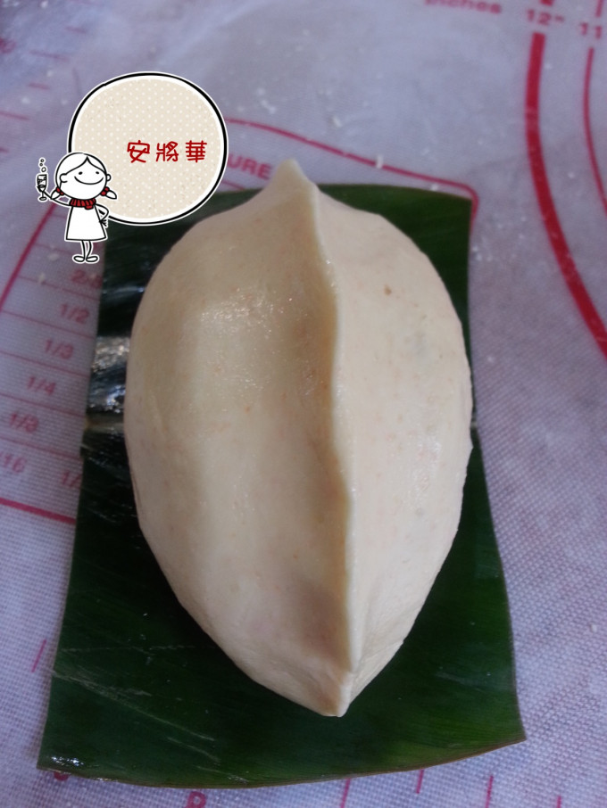 在表面上捏出一條凸出的長脊,底下墊月桃葉、香蕉葉、粽葉、柚子葉、饅頭紙都可