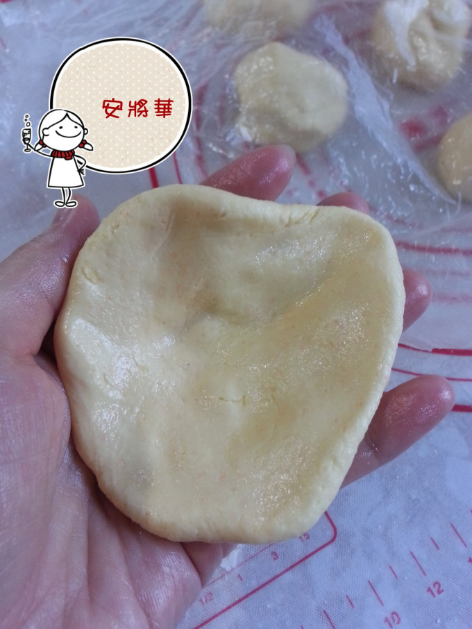 手上沾油抹勻,取一個米糰搓圓壓扁,捏出一個小凹狀