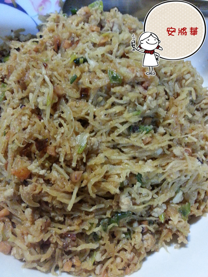 乾蘿蔔絲泡水洗淨擠乾水分切細,生蘿蔔削皮刨絲搓揉擠乾水分、蝦米泡水切細,將蝦米青蔥爆香加入豬絞肉炒熟,加入紅蔥酥乾濕蘿蔔絲炒勻放涼備用。