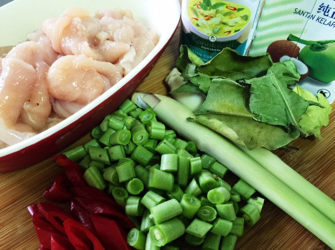 雞胸肉用米酒、魚露及太白粉(或牛奶)稍微抓一下,醃個幾分鐘。乾檸檬葉用熱水浸泡,把葉梗撕掉。香茅切段、四季豆洗淨切丁、辣椒去籽切片。